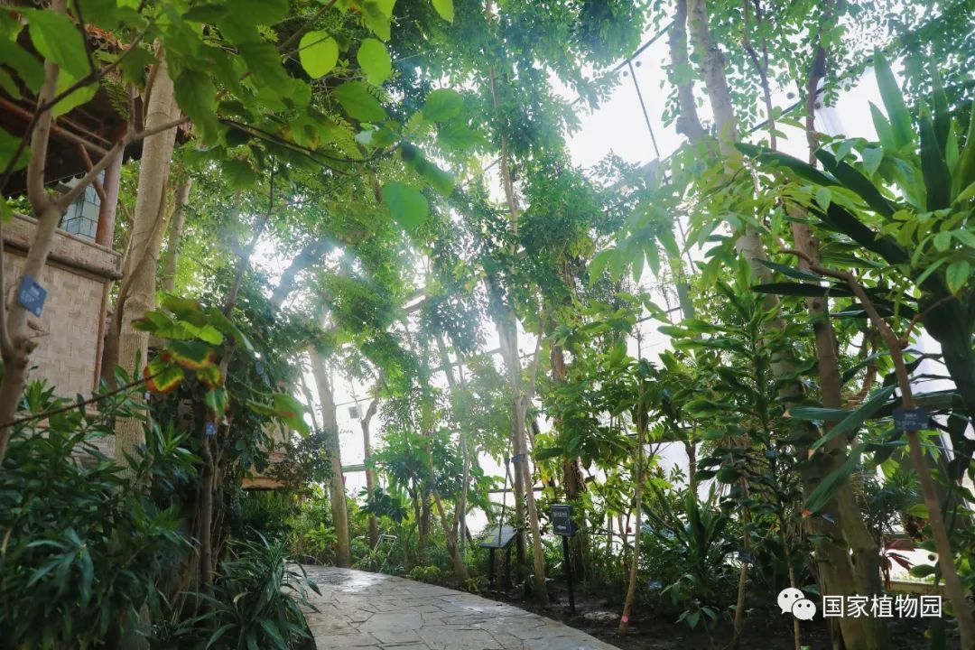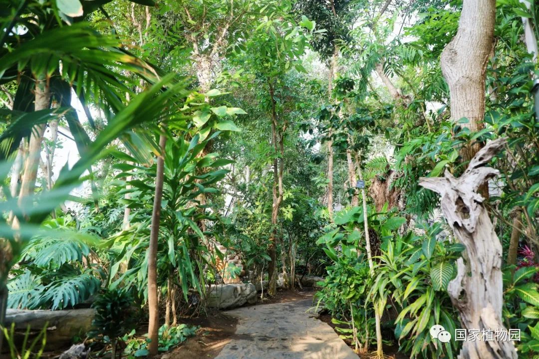热带雨林展室展示了热带雨林的独木成林、空中花园、多层结构、藤萝缠绕、板根、滴水叶尖、绞杀现象、老茎生花、老干结果、大叶地被植物等独特现象。步入热带雨林展室可以感受到这里丰富的植物种类,植物间高低相映,疏密相间,在这里众多高大新奇的植物景观将一一呈现在眼前。