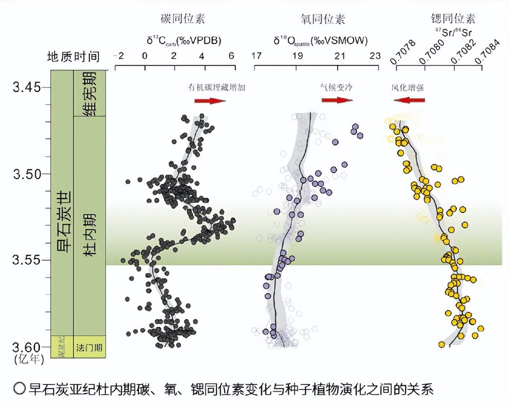 研究发现,海水的锶同位素比值在石炭纪早期开始下降,并伴随着碳酸盐碳同位素比值和牙形刺氧同位素比值的增加。而令人惊讶的是,这3个同位素体系随时间的变化正对应种子植物早期演化阶段中最重要的一次辐射事件。