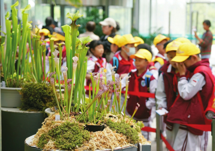 4月27日,学生们在国家植物园温室参观瓶子草。2022年4月18日,国家植物园在北京正式揭牌。如今,国家植物园已完成植物种类资源本底调查,共收集世界各地的植物1.7万余种,其中珍稀濒危植物近千种,收藏植物标本突破300万份。