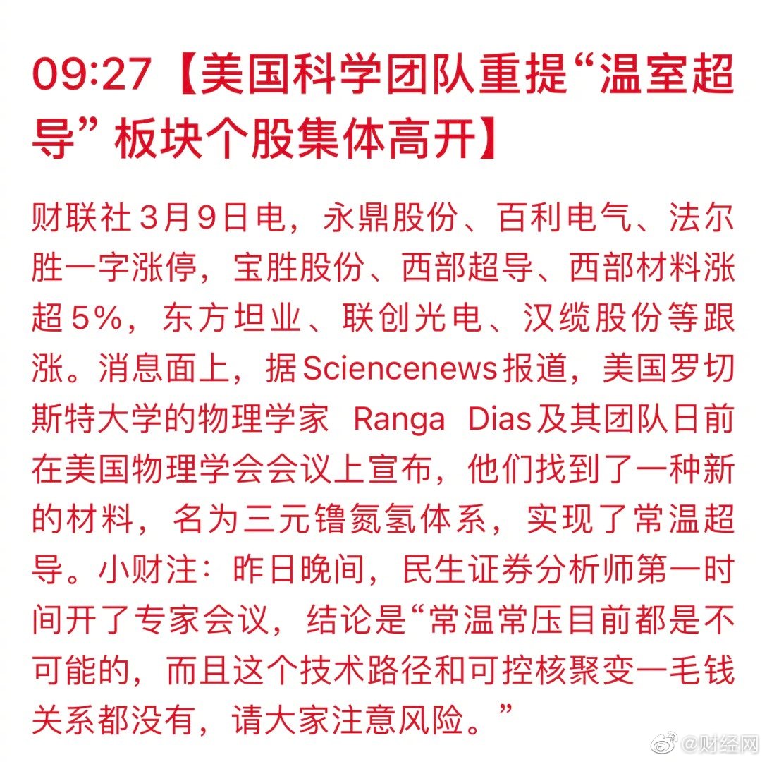【美国科学团队重提“温室超导” 板块个股集体高开】#股民连夜学习室温超导# 永鼎股份、百利电气、法尔胜一字涨停,宝胜股份、西部超导、西部材料涨超5%,东方坦业、联创光电、汉缆股份等跟涨。消息面上,据Sciencenews报道,美国罗切斯特大学的物理学家 Ranga Dias及其团队日前在美国物理学会会议上宣布,他们找到了一种新的材料,名为三元镥氮氢体系,实现了常温超导。昨日晚间,民生证券分析师第一时间开了专家会议,结论是“常温常压目前都是不可能的,而且这个技术路径和可控核聚变一毛钱关系都没有,请大家注意风险。”(财联社APP)