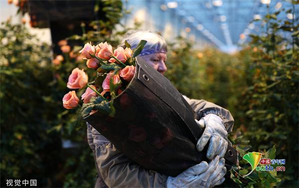 当地时间2023年3月1日,俄罗斯克拉斯诺达尔地区,妇女节前夕,一名温室员工在采摘玫瑰。