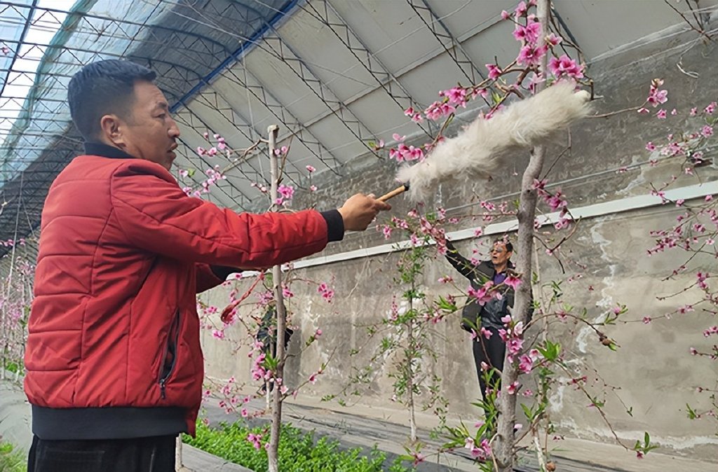 “现在正值桃树生长关键期,一定要做好授粉、通风、控温等工作,还要及时进行疏花疏果,合理疏花疏果,才能保证结出的桃子更大、更甜,品质更高。”温棚园区负责人马来红边说边忙着用鸡毛掸子给桃树疏花、授粉,呈现出一幅人面桃花相映红的怡然景色。