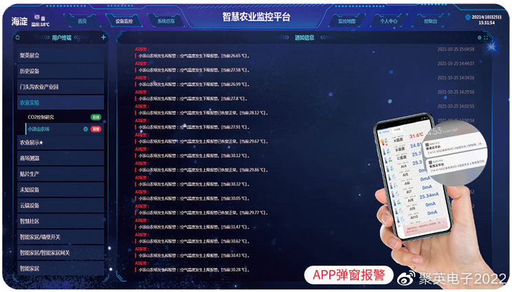 云平台自带有异常报警功能,可对检测到的温度、CO2浓度等数据超过阈值、网络波动、断电等原因造成的通讯异常或设备离线等情况,向农户自动报警。报警方式支持APP、短信、电话、微信、邮箱等,提示农户快速响应;
