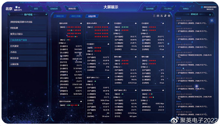 自动监测功能,监测频率可调整,最高可为一分钟一次,24小时不间断运行。传感器获取环境信息后,通过4G、5G、WIFI、LoRa等无线网络,将每一个监测点的温湿度、CO2浓度、设备运转信息等数据,展示在电脑或安卓/IOS手机端云平台界面上,一目了然地掌握温室内的环境信息,以及风扇、补光灯、杀虫灯、喷淋机等设备状态信息;