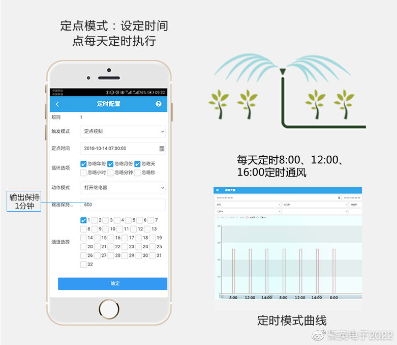 支持设备控制功能,将传感器检测数据与风扇、补光灯等设备联动,在云平台点击相应设备,即可呼出设备控制窗口,即可实现对温室内空调、喷淋设备的控制。同时支持通过自定义逻辑设置,根据温室内温湿度等变化情况,设定开窗系统、遮阳系统等设备的自动启停控制;