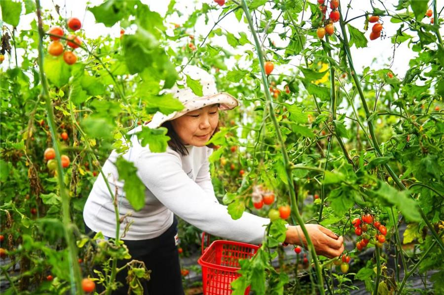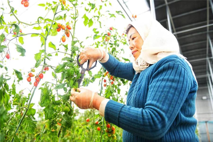 一位女工正为圣女果秧苗打杈整枝。秦龙摄
