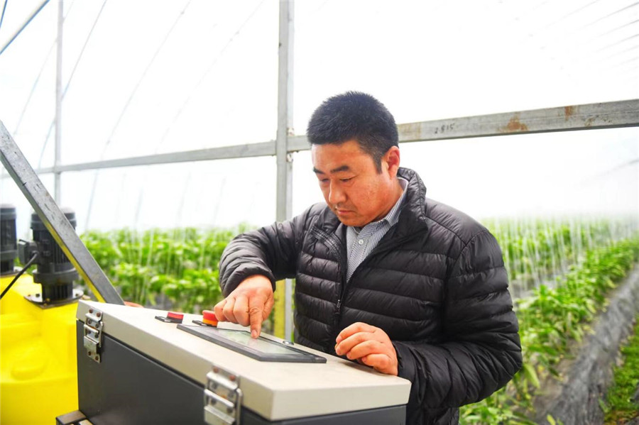 技术人员正在操作大棚水肥一体机。秦龙摄