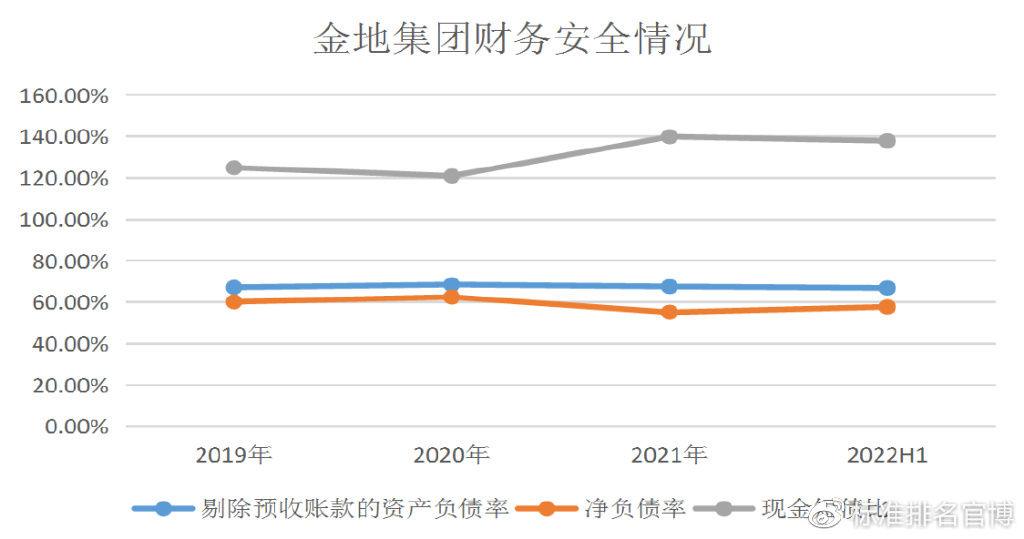 从财务安全情况来看,2022年上半年,公司剔除预收账款的资产负债率为66.9%,净负债率为57.8%,现金短债比为1.38倍,“三道红线”指标处绿档。