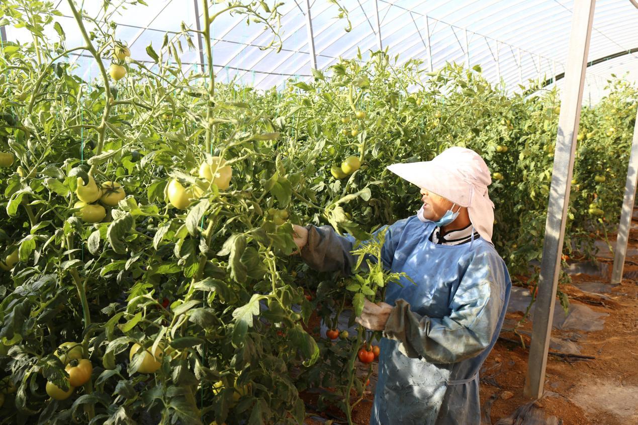 在其中一栋西红柿种植大棚内,一排排近2米高的西红柿秧上硕果累累,一个个青红不一的果实饱满圆润,分外诱人。工作人员正穿梭在地垄间,采摘已经成熟的西红柿。