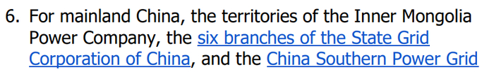 同时,修订稿对中国的电力市场边界作出了定义,将中国划分为八个独立的电力市场边界,包括:内蒙古电网、国家电网六大分部(华北分部、华东分部、华中分部、东北分部、西北分部、西南分部)以及南方电网。