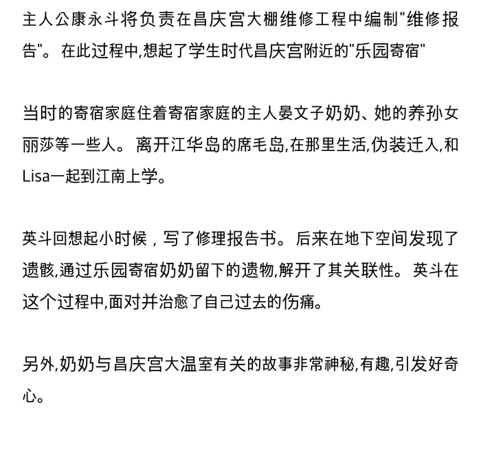 《大温室修理报告书》是一部历史小说,讲述了30代女性英斗负责记录昌庆宫大温室维修工程白皮书的故事~