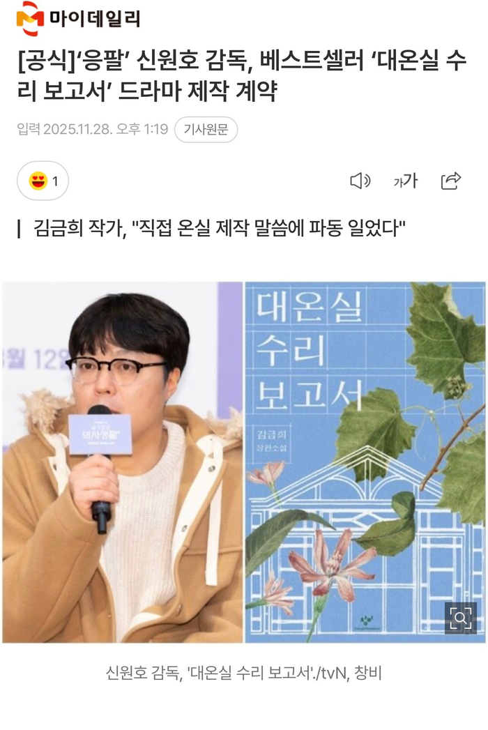 申原昊上班!申PD和金锦姬作家签约,将金作家去年写的小说#大温室修理报告书#制作成电视剧~
