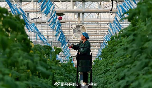 工作人员正在对樱桃番茄进行落蔓处理。习守政摄近日,在邯郸市大名县智慧农业科技产业园樱桃番茄种植基地,工作人员正在对樱桃番茄进行落蔓处理。这些樱桃番茄长势喜人,即将迎来采收季。