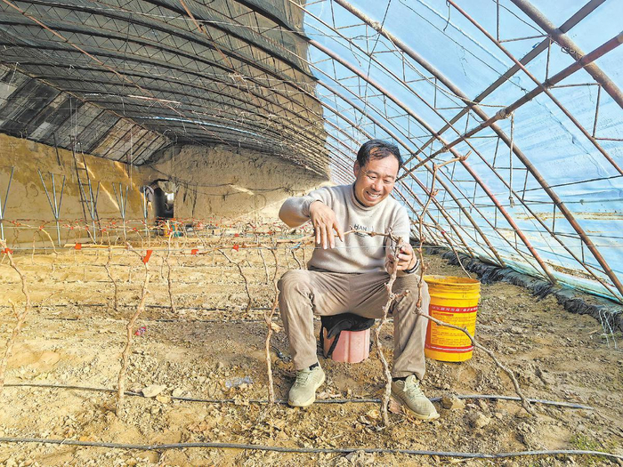 12月1日,靖边县东坑镇硬地梁村,村民杜益国正在温室大棚内进行葡萄藤修剪和固定枝干作业。“现在是萌芽关键期,必须及时修剪,才能保证后续开花结果。”杜益国一边忙碌一边介绍。
